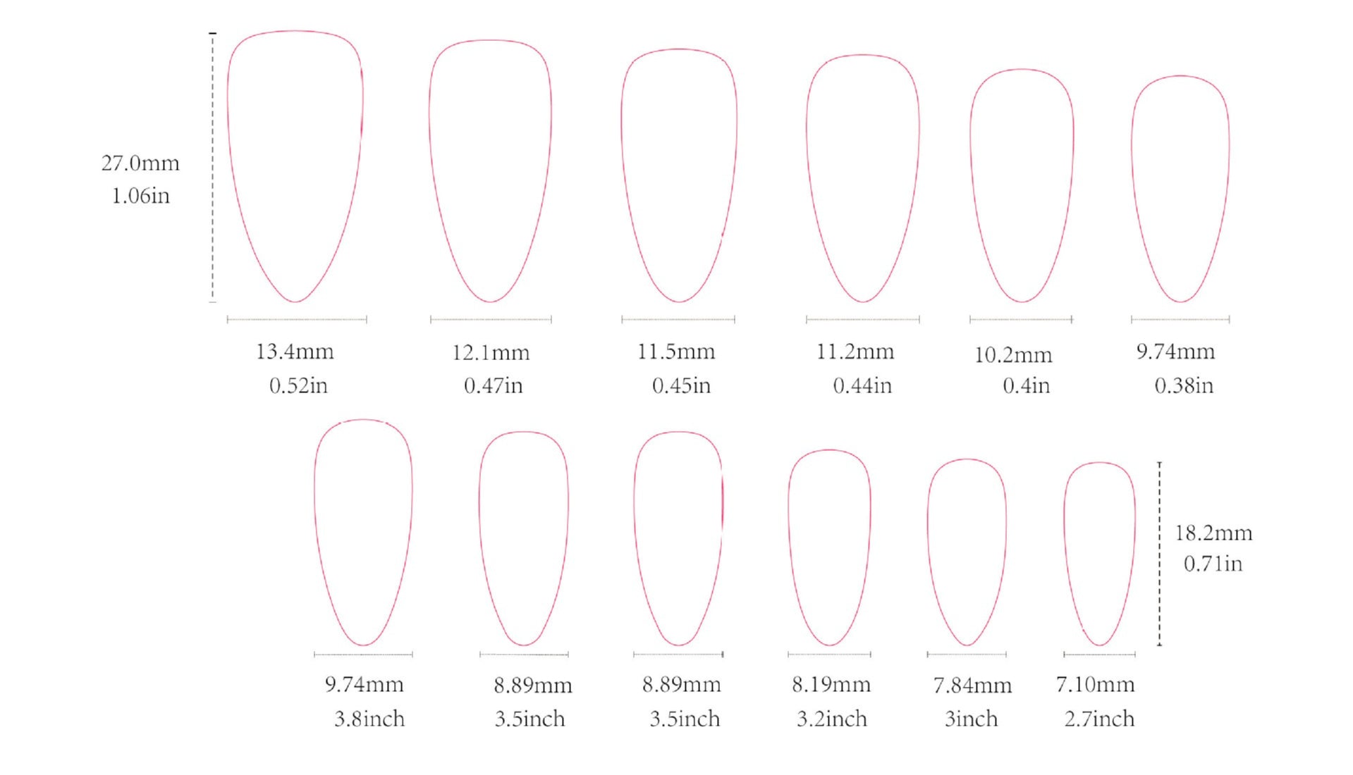 - 12 sizes. 24 nails per box: Each set of 24 press-on nails. available in 12 different sizes. ensures a perfect custom fit. Plus. you'll get everything you need. including nail glue. adhesive tabs. a double-sided nail file. and a cuticle stick.