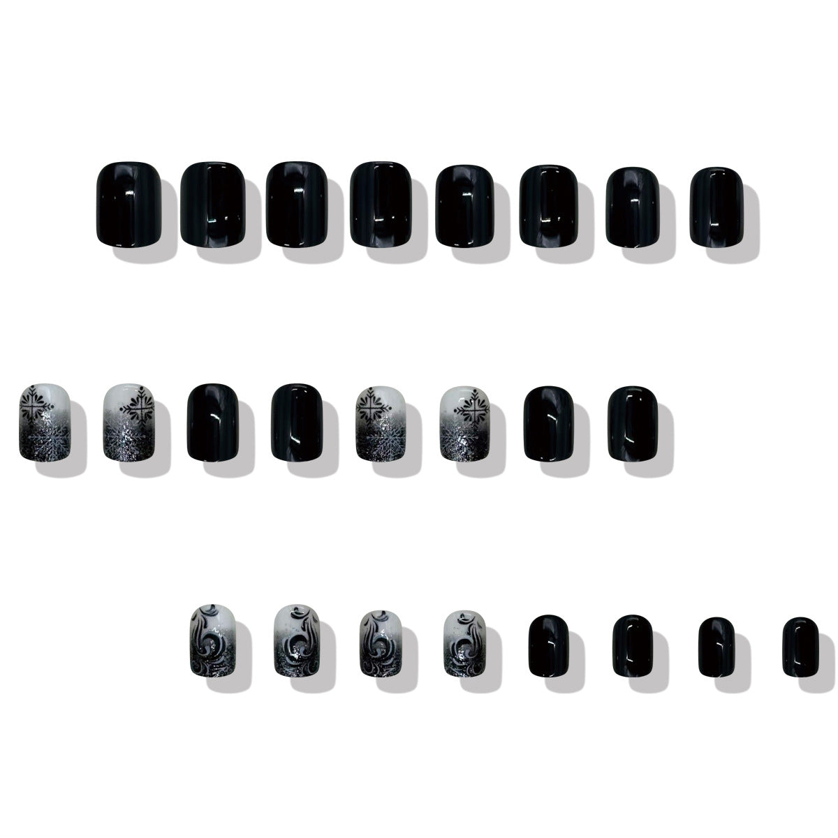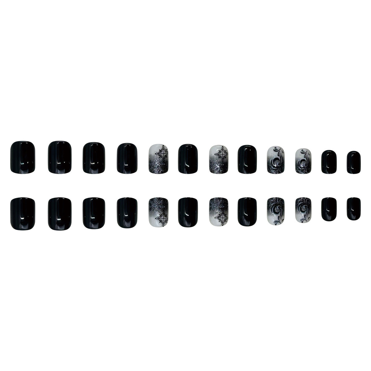 - 12 sizes. 24 nails per box: Each set of 24 press-on nails. available in 12 different sizes. ensures a perfect custom fit. Plus. you'll get everything you need. including nail glue. adhesive tabs. a double-sided nail file. and a cuticle stick.