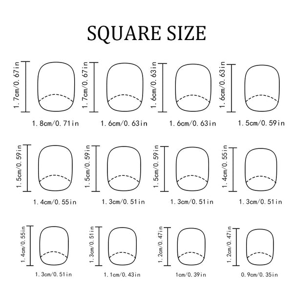 - 12 sizes. 24 nails per box: Each set of 24 press-on nails. available in 12 different sizes. ensures a perfect custom fit. Plus. you'll get everything you need. including nail glue. adhesive tabs. a double-sided nail file. and a cuticle stick.