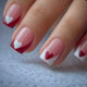 Apply an even layer of glue to both your natural nails and the back of the press on nail. Line it up with your cuticle and apply at a slight downward angle. Press down firmly and hold for 10-20 seconds. Then. file or clip to get your perfect shape.