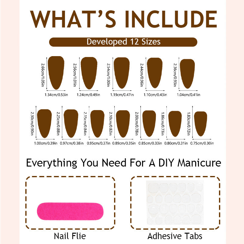 - 12 sizes. 24 nails per box: Each set of 24 press-on nails. available in 12 different sizes. ensures a perfect custom fit. Plus. you'll get everything you need. including nail glue. adhesive tabs. a double-sided nail file. and a cuticle stick.